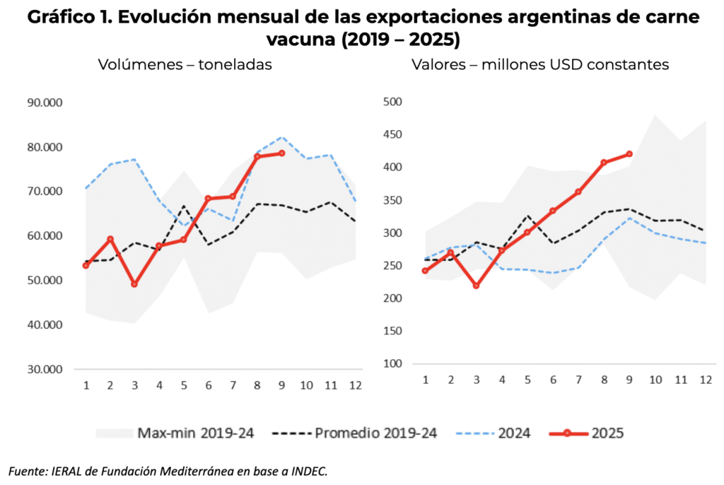 Entre enero y septiembre de 2025, las exportaciones argentinas de carne vacuna y subproductos (carne con o sin hueso, enfriada o congelada, menudencias y huesos del desposte) acumularon un total de 572 mil toneladas (peso producto) y USD 2.826 millones, un 11% menos volumen y 17% más valor que en el mismo período del año pasado, respectivamente.