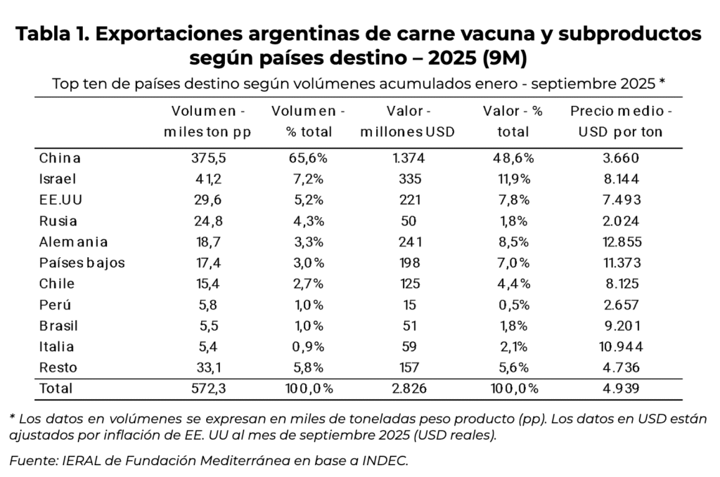 Las exportaciones de carne vacuna argentina se encuentran fuertemente concentradas en el mercado chino. Entre enero y septiembre de 2025, China absorbió el 65,6% de las cantidades exportadas, lo que equivale a unas 375 mil toneladas peso producto. Muy por detrás se ubicaron Israel con 7,2% (41 mil ton), Estados Unidos con 5,2% (29,5 mil ton) y Rusia con 4,3% (24,7 mil ton). Luego aparecen Alemania, Países Bajos y Chile, con participaciones individuales de entre 2,7% y 3,3% del total, y finalmente Perú, Brasil e Italia, cada uno con menos del 1%.