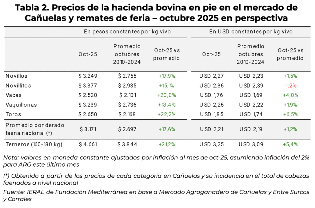 El precio promedio ponderado de la faena nacional —obtenido a partir de los precios de cada categoría en Cañuelas y su incidencia en el total de cabezas faenadas a nivel nacional— alcanzó en octubre los $3.171 por kilo vivo. En pesos actualizados a valores del último mes, este nivel se ubica 30% por encima de octubre de 2024, casi 18% por encima del promedio de los últimos quince octubres y 15% por encima del promedio mensual del período 2010-2024.
