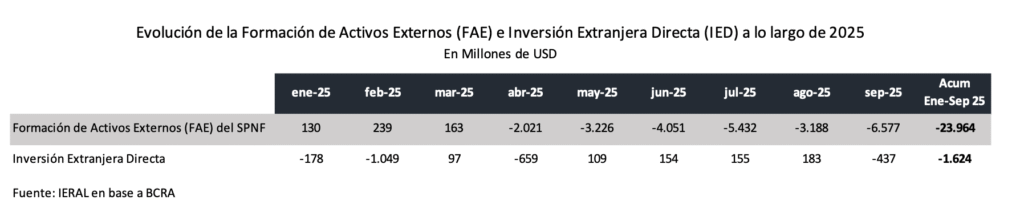 - Así, desde el lanzamiento del programa del 11 de abril, que inauguró el esquema de bandas y levantó el cepo cambiario para personas físicas, pero no para personas jurídicas, se tiene que, por un lado, la evolución de la Inversión Extranjera Directa se mantuvo cercana a cero en términos netos, mientras que la Formación de Activos Externos por parte de personas físicas primero pasó a un andarivel del orden de los 3,1 mil millones de dólares por mes entre abril y junio de este año, para trepar a un promedio mensual de casi 6,0 mil millones de dólares entre julio y octubre (estimando el último mes, ya que datos oficiales se conocen hasta setiembre);