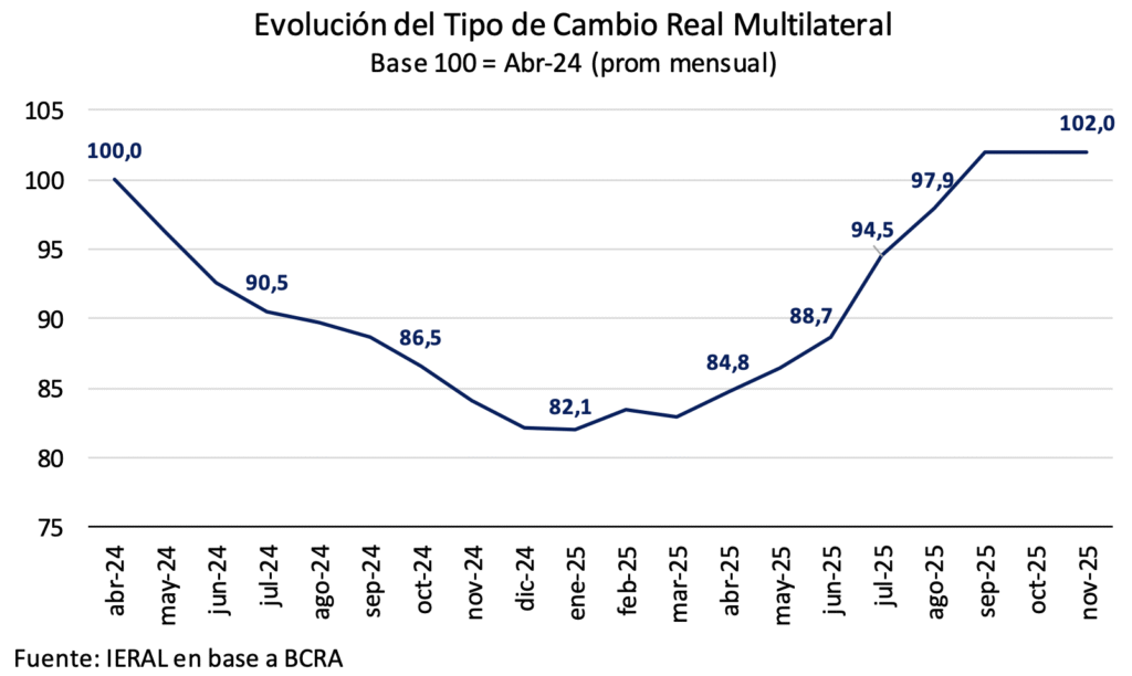 Desde el segundo trimestre del año, hubo una corrección significativa del nivel del tipo de cambio real que, en el caso de la medición multilateral, implica una mejora de competitividad cambiaria del orden del 25,0 %. De modo convergente, la economía del presente no registra excedentes de pesos apreciable en el plano transaccional. El M2 privado es estimado en torno a los 7,3 puntos del PIB; o sea, 3,6 puntos porcentuales inferior al guarismo de marzo de 2018, cuando comenzaron las turbulencias de la segunda parte de la gestión Macri.