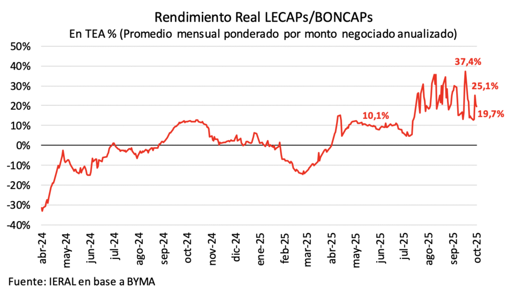 El mundo pesos no fue la excepción y los rendimientos ajustaron al alza una vez que la incertidumbre comenzaba a aumentar, para luego exhibir una mejoría en el margen. Tras haber tocado un mínimo en torno al 14% real anual a partir de los anuncios del Secretario del Tesoro estadounidense, la tasa promedio ponderada por volumen de las LECAPs/BONCAPs, neta de inflación, terminó cerrando en torno al 20% anual a inicios de octubre, guarismo levemente por encima del cierre de agosto. Habrá que ver si surgen nuevas novedades y cómo terminarán impactando en el mundo pesos.