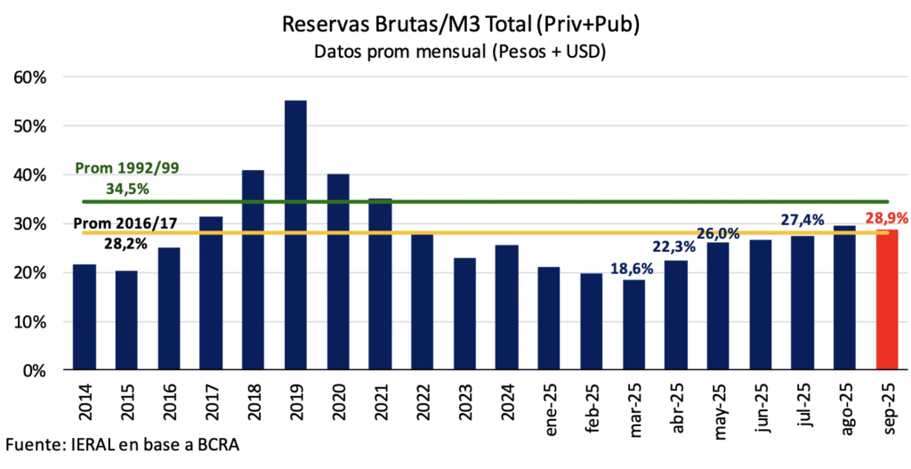 Con el dólar testeando la banda superior, se acrecentaron las dudas sobre el esquema cambiario. No obstante, el nivel promedio de reservas del Banco Central en septiembre otorga cierta espalda para defender la banda, al menos transitoriamente. El siguiente gráfico muestra la relación entre reservas brutas y el agregado monetario M3 total, que incluye circulante, depósitos transaccionales (cuenta corriente y cajas de ahorro) y plazos fijos, en pesos y en dólares, tanto del sector público como del privado. El valor promedio mensual de septiembre se ubica en el 29%, un poco por debajo del guarismo promedio de 1992/99 y levemente por encima del promedio 2016/17.