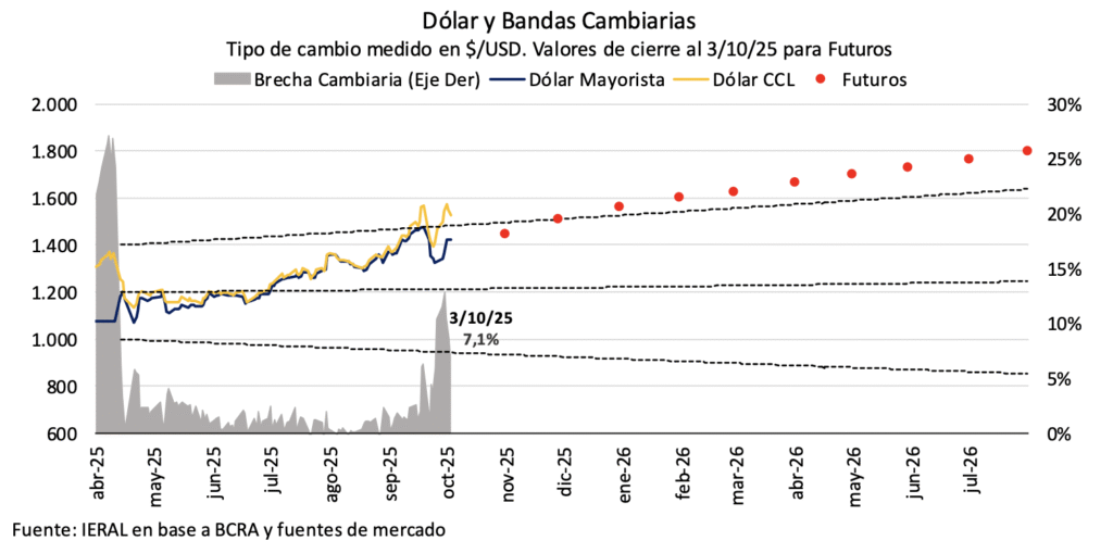 El mercado también comenzó a buscar cobertura en instrumentos dollar linked, especialmente en la letra más corta (D31O5 con vencimiento a fines de octubre), con la autoridad monetaria abasteciendo esta demanda (operó aproximadamente USD 1,7 mil millones en el secundario en tres ruedas). Esta maniobra generó que las tasas implícitas de los contratos futuros cayeran, a la par que bajaba la presión sobre el dólar financiero y por ende, la brecha comprimió por debajo de los 2 dígitos; no obstante, esta estrategia no está exenta de riesgos dado que un eventual salto del tipo de cambio en caso de que se abandonara el esquema de bandas traerá consigo un costo tanto para el fisco, a través de los dollar linked, como para el Central (a través de su stock de futuros). Recordemos que el Banco Central reforzó el poder de fuego realizando un canje con el Tesoro, entregando títulos a tasa fija capitalizables (tanto BONCAPs como LECAPs) a cambio de una canasta de bonos y letras atadas al dólar, con vencimientos escalonados entre noviembre de 2025 y junio de 2026, por un equivalente a USD 7,3 mil millones.