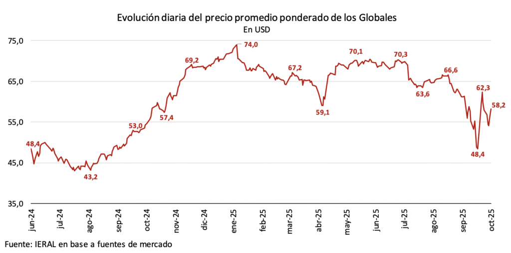 Los bonos soberanos en dólares no se quedaron atrás y aceleraron sus pérdidas, aunque con un leve repunte hacia fines de la semana anterior ante el viaje de Caputo y la expectativa de algún potencial anuncio relativo a la ayuda estadounidense. De esta manera, el precio promedio ponderado por outstanding cerró al 3/10 en USD 58,2, 6,6% por debajo del máximo intrames que se alcanzó el 24/9 ante la euforia que generó el contundente apoyo de USA. Esta dinámica tiene su correlato en el riesgo país, que subió fuerte y luego descendió parcialmente para terminar ubicándose hacia fines de la semana anterior en los 1080 pbs. Este escenario se traduce en una suba de 250 pbs respecto a fines de agosto.