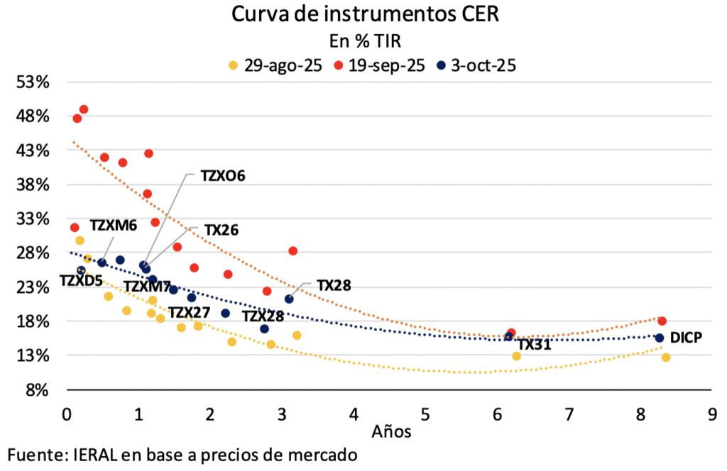 Como se puede observar en el gráfico adjunto, la curva CER del Tesoro se desplazó hacia arriba en relación con lo que se observaba a fines de agosto, especialmente de 2026 en adelante, señal del deterioro de las expectativas. A los precios actuales, estos instrumentos ofrecen rendimientos reales positivos de 24% + inflación en 2025 (excluyendo el TZXO5 que vence a fin de mes), 26% + inflación en el tramo 2026 y 19% + inflación en el resto de los plazos.