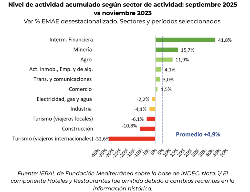 A continuación de la actividad financiera, se destacan la minería y el agro que acumulan mejoras significativas desde noviembre de 2023 (+15,7% y +11,9%, respectivamente), conformando así una terna bien definida de sectores dinámicos para la economía argentina actual.