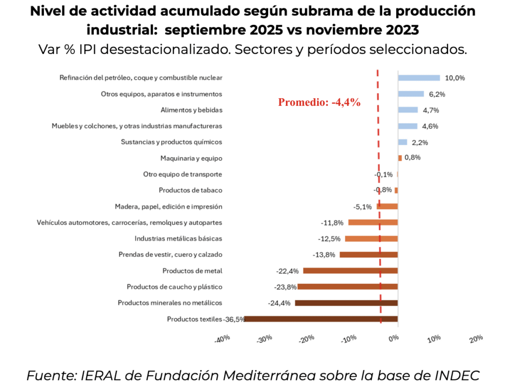 Se destaca, porque se profundiza su situación, la caída acumulada en industria de productos textiles, que se ubica 36,5% por debajo del nivel que experimentó en noviembre de 2023. Hay que remontarse a tiempos de la pandemia para hallar una caída de esos órdenes de magnitud en la producción de este sector. Los sectores que le siguen, en términos de su merma en la producción, son productos minerales no metálicos (-24,4%), productos de caucho y plástico (-23,8%) y productos de metal (-22,4%).
