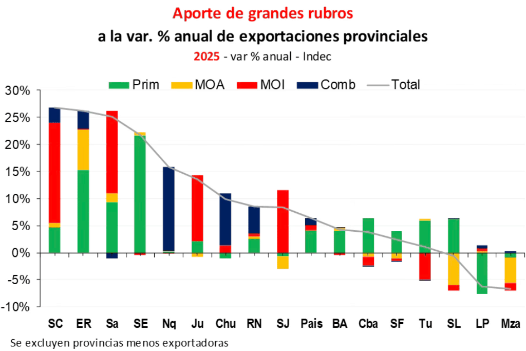 La dinámica reciente de las exportaciones refuerza este proceso de reconfiguración productiva. Durante 2025, se observa un fuerte crecimiento en las exportaciones de sectores vinculados a la minería, los hidrocarburos y el agro pampeano, que se consolidan como los principales generadores de divisas.