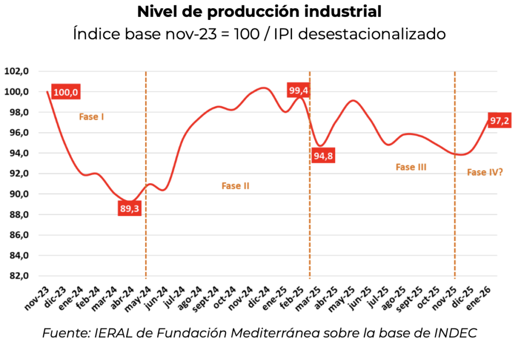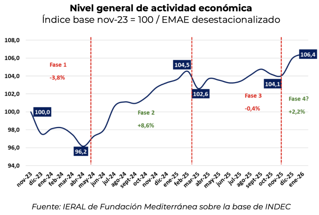 Ayer se conoció la información de Estimador Mensual de Actividad Económica (EMAE) correspondiente al primer mes de 2026. El indicador oficial encadenó su segundo mes de crecimiento durante el mes de enero, creciendo 0,4% respecto del mes previo. El mes previo había experimentado un importante crecimiento, de 1,8%, y la continuidad de este incremento en la actividad resulta alentadora. En ese sentido, cobra más impulso la posibilidad que estemos iniciando una fase 4 en lo que hace al crecimiento económico durante la gestión de gobierno actual.