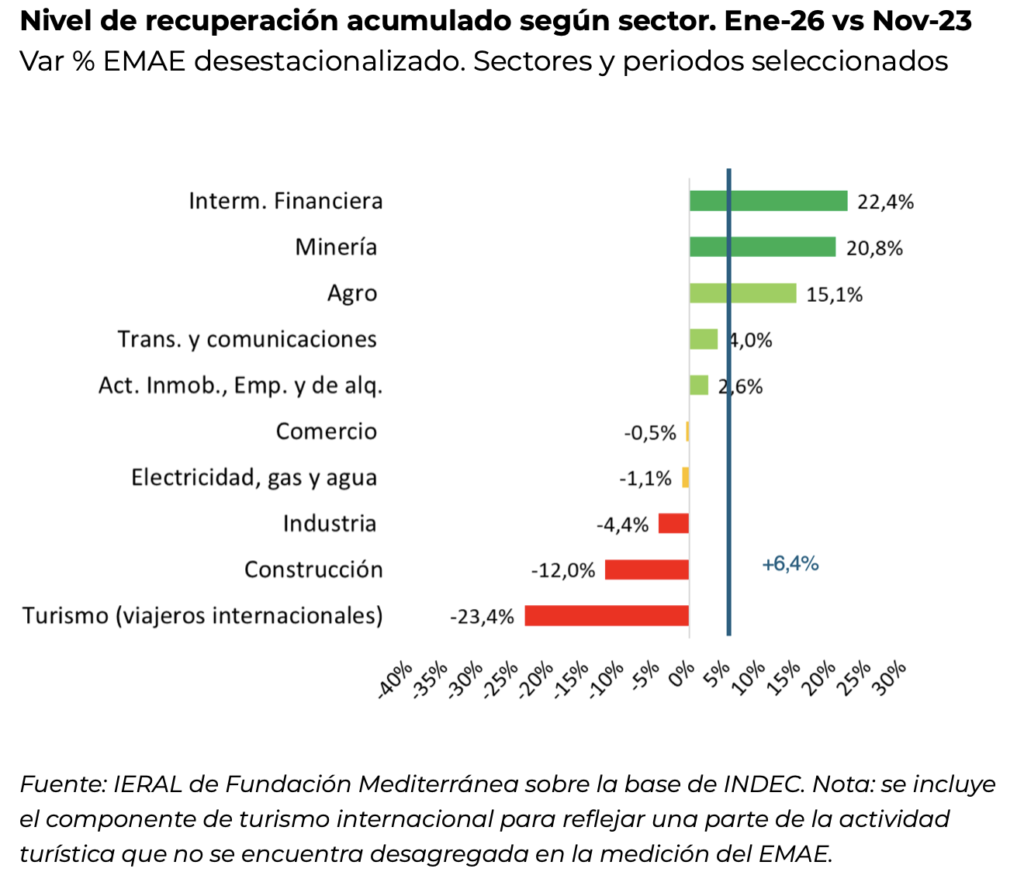 En lo que va desde noviembre de 2023 hasta la actualidad, los sectores con mejor desempeño incluyen a la intermediación financiera, la minería y el agro. Se suman a las actividades en terreno positivo transporte y comunicaciones y actividades inmobiliarias, empresariales y de alquiler. Entre los segmentos más rezagados se ubican la industria manufacturera, la construcción y el segmento de turismo internacional.