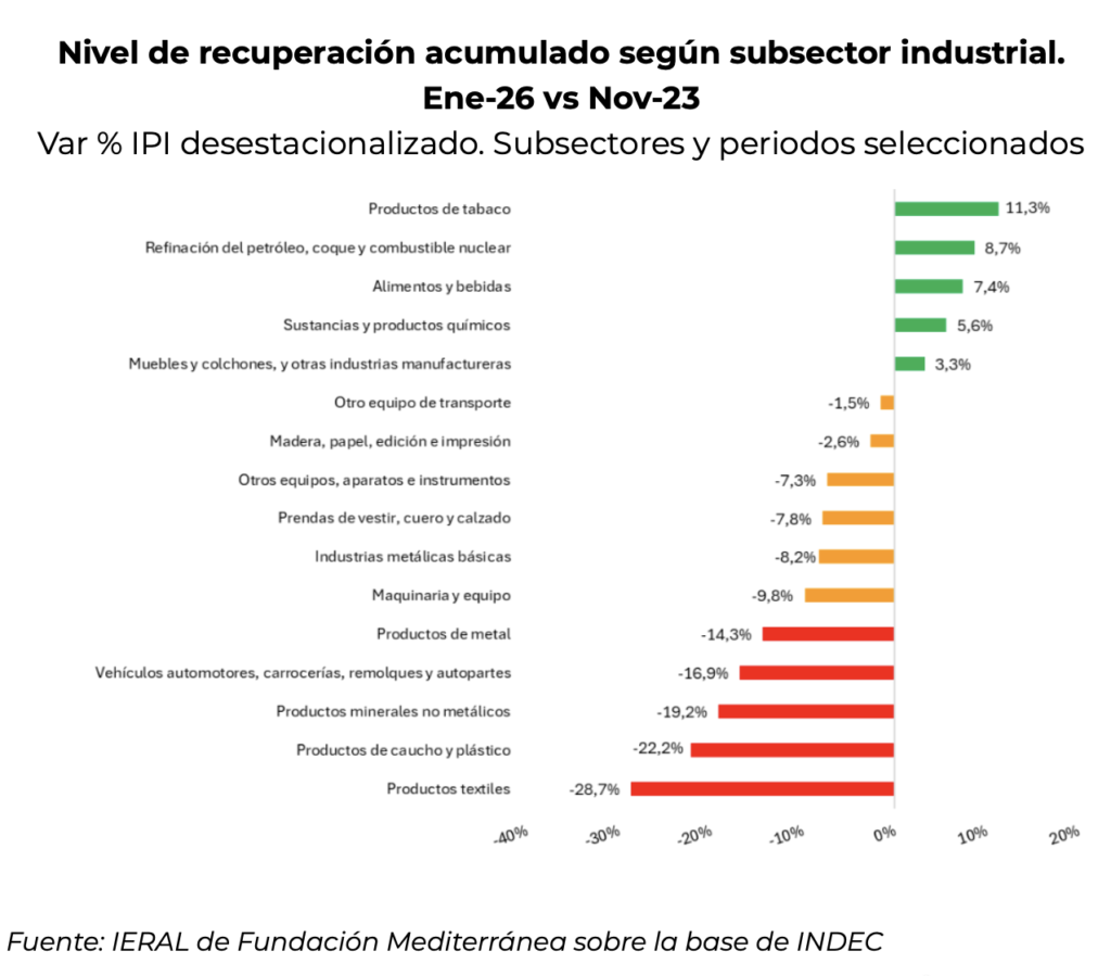 Si se examina la realidad de los principales sectores económicos, en enero gran parte de las actividades económicas tuvieron ligeras caídas, mientras que el crecimiento se asentó en minería, actividad industrial y construcción. No obstante, persiste una gran divergencia acumulada.