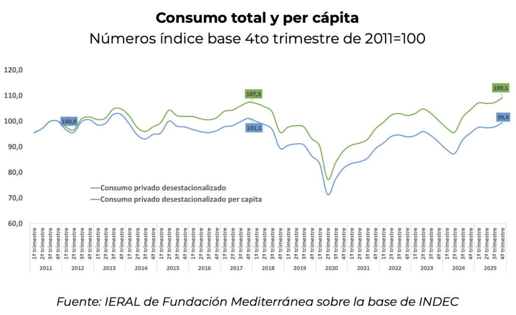 Ese indicador refleja un crecimiento también, tanto en 2025 como en los primeros dos años de gobierno, porque aún descontando el crecimiento poblacional el crecimiento ha sido significativo. No obstante, en la comparación histórica el consumo privado per cápita se ubica 2% por debajo del nivel de 2017 y resulta comparable al que se verificó en el año 2011.