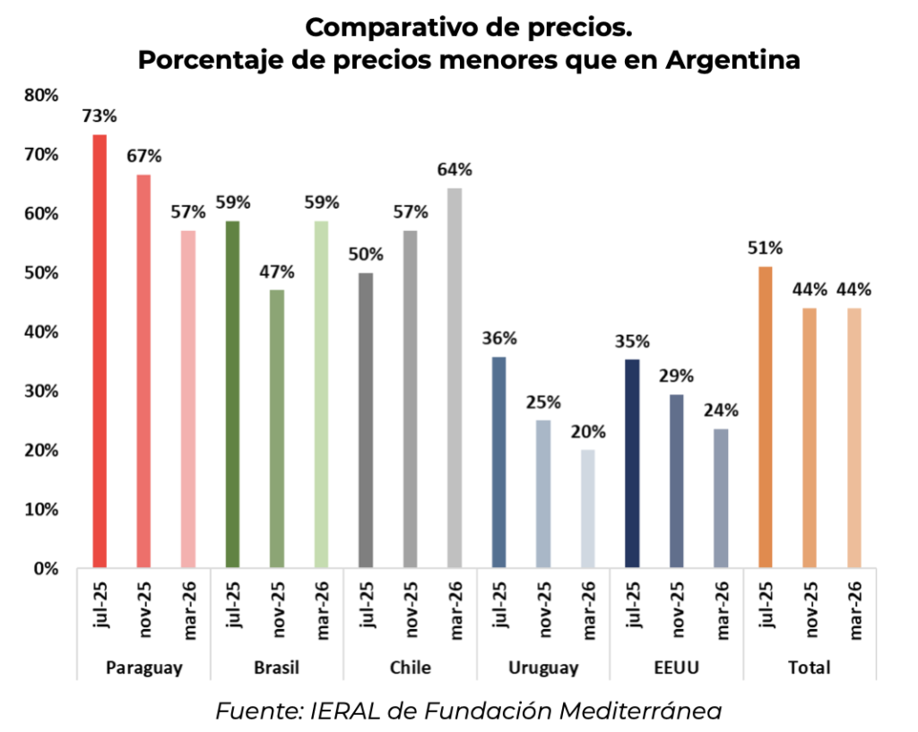 El país con menores costos comparados (considerando diferencias promedio de precios) sigue siendo Paraguay, en el que 57% de los insumos y servicios relevados son más económicos que en Argentina.