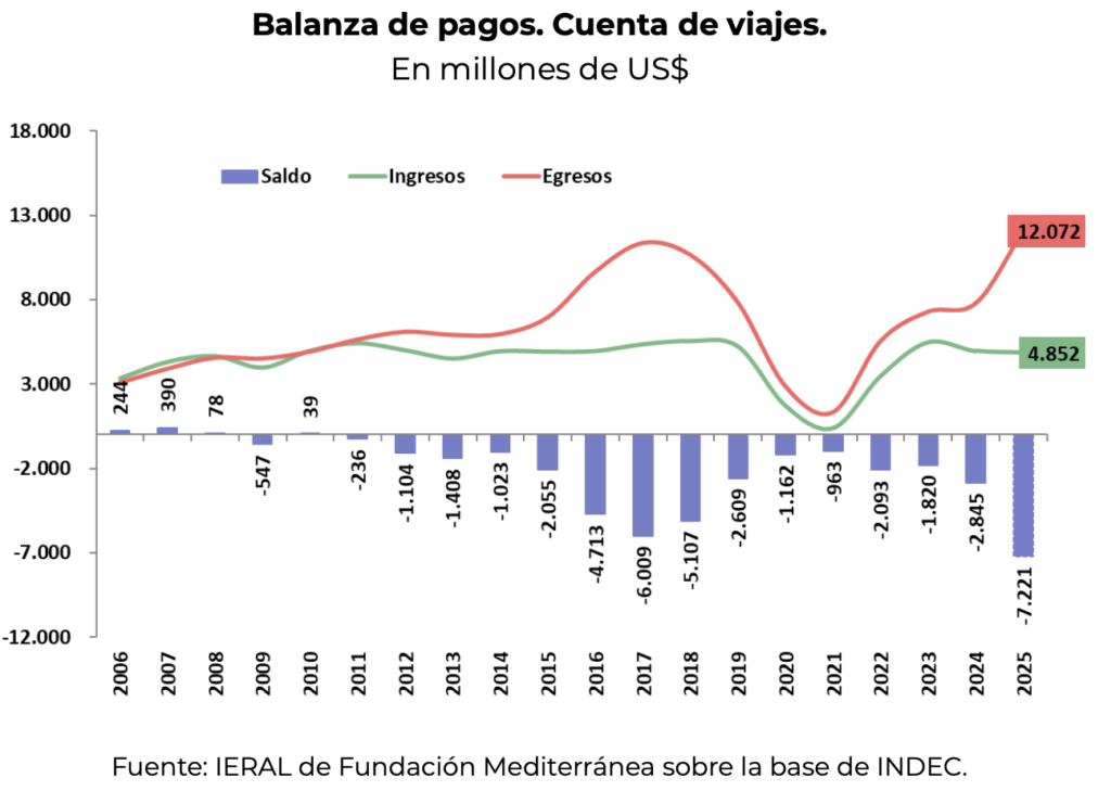 Con cifras recientemente publicadas por INDEC, reflejando los movimientos de la balanza de pagos, es posible confirmar que durante 2025 se verificó un déficit de divisas cercano a los US$ 7.200 millones motivado por la cuenta de viajes, que casi triplicó el déficit del año anterior.