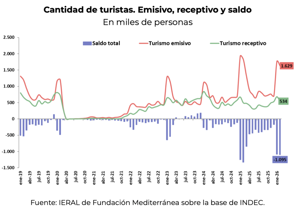De esta forma, se mantiene un déficit persistente y marcado durante los meses más fuertes de turismo de verano, pero moderadamente menos deficitarios que los del verano anterior. En febrero la diferencia entre emisivo y receptivo, superó el millón de turistas.