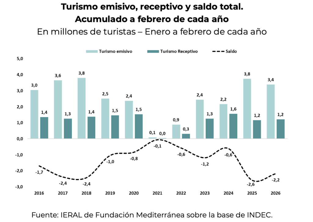 El desbalance durante los primeros dos meses (-2,2 millones de turistas) resulta moderadamente menor que el año previo (-2,6 millones) y también menor que los años 2017/18, que habían sido récords históricos de turismo emisivo, aunque las diferencias no son de magnitud.