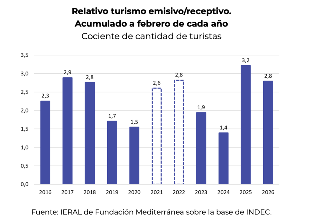 El cociente entre turismo emisivo y receptivo refleja que, por cada turista internacional arribado, 2,8 argentinos hicieron turismo en el exterior. Desde esa óptica, el desbalance es similar al de los años 2017 y 2018. En 2025, por su parte, ese cociente había sido un récord histórico (3,2 argentinos haciendo turismo en el exterior por cada turista internacional en el país).