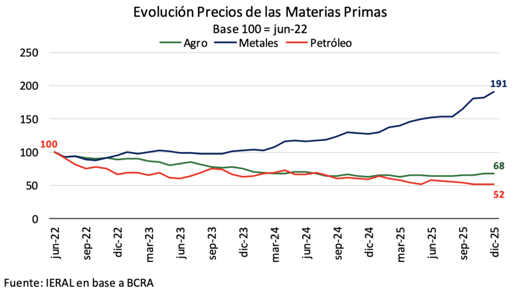 A nivel macro, y focalizando en la evolución de los términos de intercambio de la Argentina, existe el riesgo de un ciclo desfavorable, que se prolongue en el tiempo. Los datos de noviembre fueron un alerta en ese sentido, con un impacto negativo para el poder adquisitivo de las exportaciones, que anualizado alcanzaría al 0,5 % del PIB. Tomando como base los precios internacionales de las materias primas de mediados de 2022, el recorrido ha sido bien diferenciado, con productos agrícolas cayendo 32,0 % hasta el presente y el petróleo un 48 %. En contrapartida, el precio de los metales (asociados a la transición energética) ha aumentado un 91,0 % desde mediados de 2022, pero este ítem pondera no mucho más del 7,0 % en el total de las exportaciones del país.