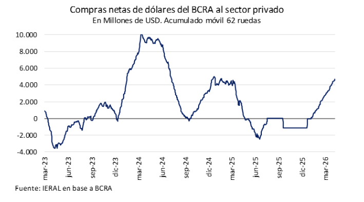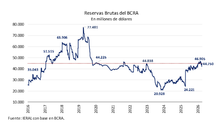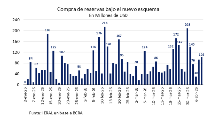 Al promediar la primera semana de abril, el stock de reservas brutas se situó en USD 44.750 millones, lo que consolida un incremento de USD 3.580 millones cuando se compara esta cifra con el cierre de 2025 (USD 41.167 millones). No obstante, pese a que la autoridad monetaria acumula compras netas superiores a los USD 4.680 millones en lo que va del año, dicho nivel se ubica por debajo del máximo local de USD 46.905 millones registrado a fines de febrero (el mayor valor desde el inicio de la actual gestión).