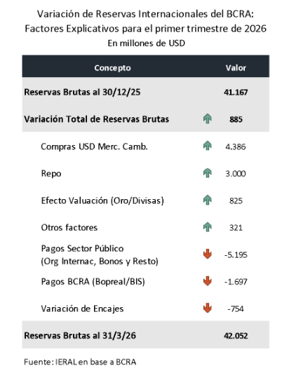 Dada la brecha en la publicación de datos desagregados por parte de la autoridad monetaria, el análisis de los factores que explican la variación de las reservas internacionales puede profundizarse con certeza únicamente hasta el cierre de marzo. No obstante, la pérdida de información derivada del rezago de los datos de abril resulta marginal, por lo que las tendencias identificadas conservan su validez analítica.