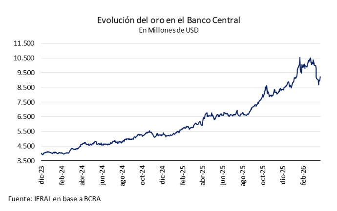 • La autoridad monetaria mantiene una tenencia de 1,98 millones de onzas troy, activo cuya volatilidad impacta directamente en el nivel de reservas brutas al contabilizarse a valor de mercado: cada variación de USD 100 en la cotización de la onza genera un ajuste contable de USD 198 millones, tratándose estrictamente de una ganancia por tenencia y no de un flujo transaccional. Pese a la corrección a la baja que se observó en marzo (producto del fortalecimiento del dólar en el mundo por el conflicto bélico), a lo largo del primer trimestre el valor del stock de oro creció casi un 8%. Este incremento aportó USD 650 millones a las reservas, elevando la participación del metal al 20% del total de activos externos (equivalente a USD 9.230 millones).