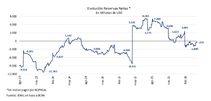 Al 8 de abril, nuestras estimaciones arrojan un saldo de USD -229 millones para las RIN, nivel que se ajusta a USD -1.530 millones si se contemplan las obligaciones derivadas del BOPREAL. En términos acumulados para 2026, estos guarismos implican una contracción de USD 1.850 millones (USD 850 millones bajo el criterio que incluye vencimientos de BOPREAL).