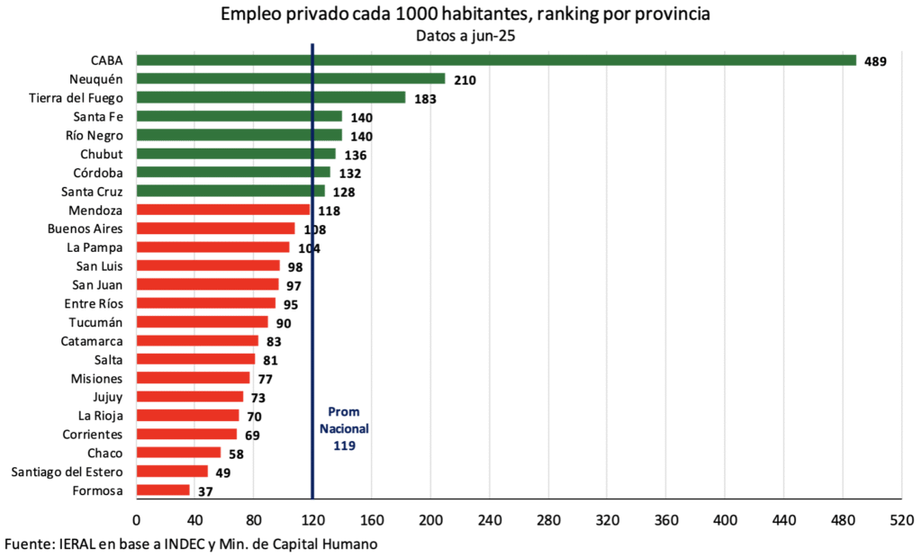 Obsérvese que, en promedio, en el país hay 119 empleos privados cada 1000 habitantes, y que cerca o por encima de ese guarismo se encuentran CABA, Neuquén, Tierra del Fuego, Santa Fe, Río Negro, Chubut, Córdoba, Santa Cruz, Mendoza, Buenos Aires, La Pampa y San Luis. Las provincias en las que se contabilizan menos de 75 empleos privados cada 1000 habitantes son Formosa, Santiago del Estero, Chaco, Corrientes, La Rioja y Jujuy.