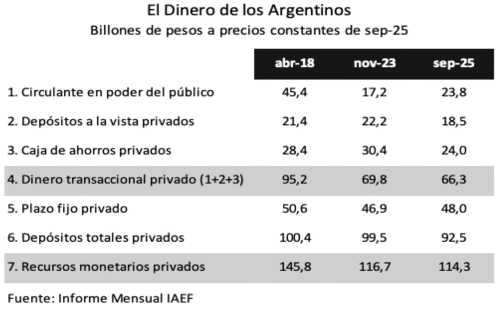 La economía no parece registrar “exceso de pesos” en el plano transaccional, como lo muestran los datos del Informe de IAEF de octubre. De acuerdo al estudio coordinado por el economista Alfredo Gutiérrez Girault, la suma del circulante, depósitos a la vista y cajas de ahorros equivale a dos tercios del guarismo de abril de 2018 medido en moneda constante.