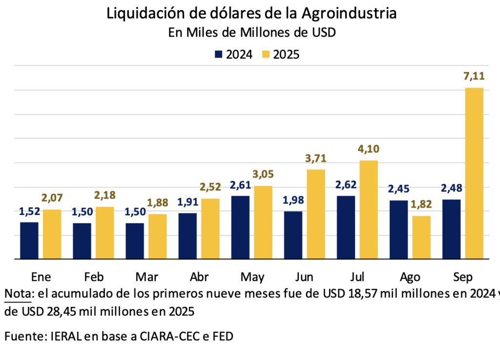 Es el caso de la eliminación temporal de retenciones para el complejo agrícola, que dio por resultado un septiembre record en materia de liquidaciones, en torno a los 7,1 mil millones de dólares, con corolarios de todos modos no demasiado constructivos: el Tesoro sólo capturó el 38,0% de ese flujo; el sacrificio fiscal fue del orden de los 0,2 puntos del PIB, y hubo también costo político, porque la mejora de precios al productor en este lapso no ha sido plena, considerando el valor teórico al mercado interno. Además, la “manta” se ha hecho más corta, ya que se prevé que para octubre-diciembre las liquidaciones de la agroindustria no superen un promedio de entre 700 y 800 millones de dólares, cuando en el período enero-setiembre los ingresos ocurrieron a un ritmo de casi 3,2 mil millones por mes.
