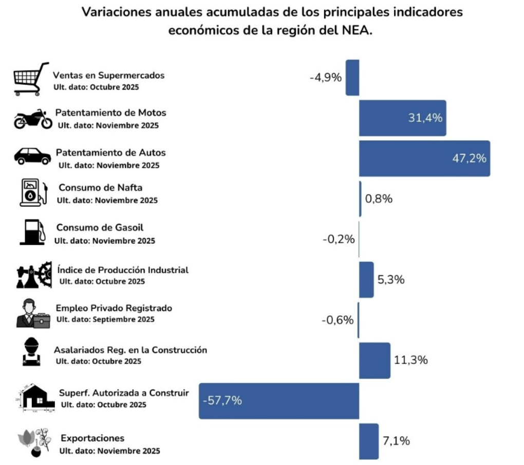 El 2025 nos demostró que la desaceleración inflacionaria, producto mayormente del equilibrio fiscal, no es suficiente para asentar las bases para un crecimiento económico homogéneo en el NEA. Dentro de la región, las provincias registraron desempeños dispares: Corrientes en auge (+4,2%), mientras que Chaco y Misiones aún se encuentran en terreno negativo (‑2,9% y ‑1,5%, respectivamente).