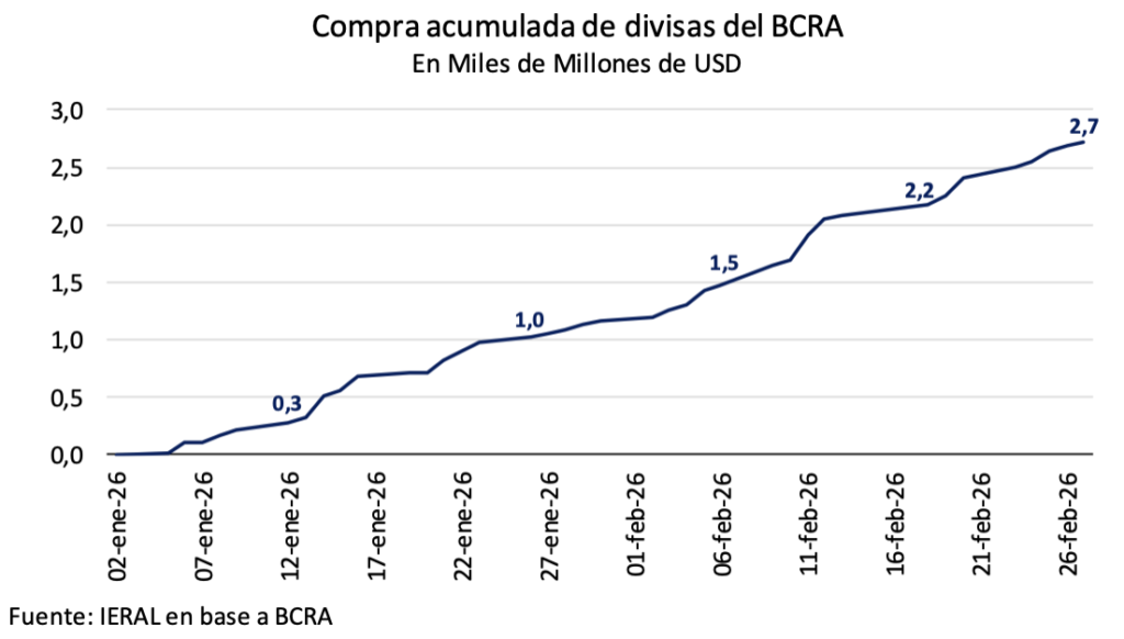 El giro de política cambiaria anunciado por el gobierno a mediados de diciembre pasado se probó exitoso a lo largo de los dos primeros meses de 2026, con compras netas acumuladas por parte del Banco Central por 2,7 mil millones de dólares.