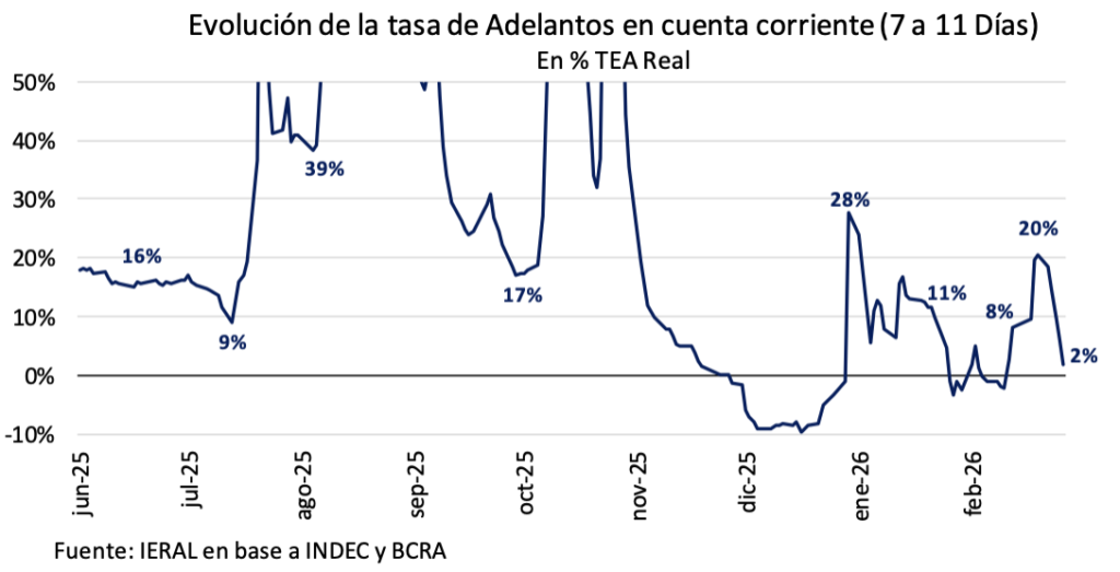 ¿Qué sucede con el tipo de cambio real? Para un nivel de 100 en 2025 y, considerando la medición multilateral, en el arranque de marzo de este año se ubica exactamente en el promedio del año pasado, cuando la cuenta corriente del balance de pagos arrojó un déficit de 2 puntos del PIB. Sin embargo, hay que tener en cuenta que en 2025 hubo dos períodos bien diferenciados, ya que el tipo de cambio real del segundo semestre registró un guarismo 7,6 % por encima (peso más depreciado) del promedio del año. Por ende, al ubicarse el tipo de cambio real de principios de marzo en el andarivel promedio de 2025, el peso se encuentra actualmente un 6,5 % más apreciado en relación al segundo semestre del año pasado.
