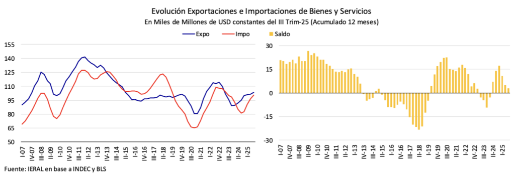 - Desde el punto de vista del tipo de cambio que equilibra variables externas e internas, es muy distinta la situación de mediados de 2018, cuando el déficit de comercio exterior de bienes y servicios llegó a 23,5 mil millones de dólares (a valores constantes), comparado con el presente, cuando todavía se preserva un pequeño superávit en el acumulado de doce meses.