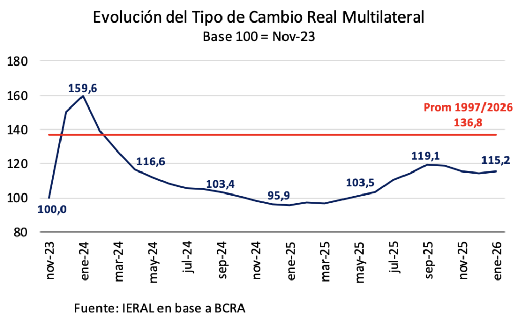 La experiencia de fin de 2023 y primer semestre de 2024 debería servir para calibrar la duración y profundidad del eventual impacto negativo sobre la actividad de un nuevo ajuste de precios relativos, si es que el esquema de bandas indexadas no alcanzara a cumplir con las expectativas. En caso de avanzarse hacia ese escenario, con un Banco Central con pocas reservas, la eliminación del cepo a personas jurídicas y el resto de restricciones que subsisten debería servir para que, con anclas fiscal y monetaria apropiadas, el ingreso de capitales genuinos comience a darse antes de que el tipo de cambio real llegue al pico observado en enero 2024 (que se ubicó un 17 % por encima del promedio 1997/2026). A su vez, la necesidad del Banco Central de recuperar reservas haría que tampoco se alcance el piso del tipo de cambio real de enero 2025 (un guarismo 30,0 % por debajo del promedio de 1997/2026),