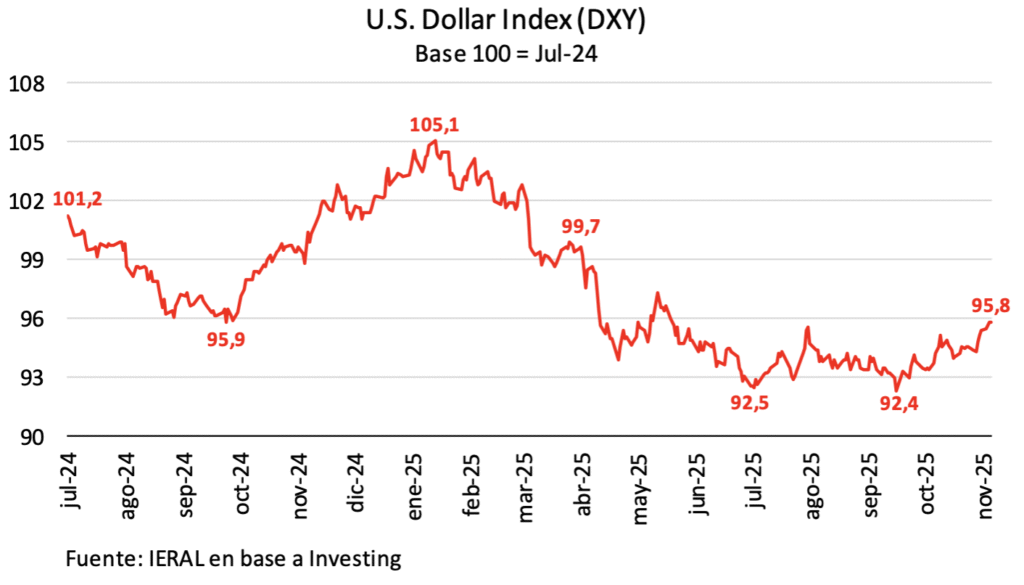En el caso de los Estados Unidos, tras crecer un 2,8 % en 2024, la variación anual del PIB podría aterrizar en un 2,0 % en 2025 y un guarismo algo inferior en 2026. La Reserva Federal ha comenzado a bajar las tasas de interés, pero subsisten interrogantes acerca de cuán agresivo puede terminar siendo el aflojamiento monetario. La suba de aranceles de importación está impactando en la “inflación de bienes”, pero esto por el momento está siendo más que compensando por la desaceleración de la “inflación de servicios” y por la baja del precio de los combustibles. Sin embargo, la política fiscal de Washington, con un déficit estabilizado en 6,3 puntos del PIB, y la ascendente deuda pública, que se acercaría al 130 % del PIB el año próximo, mantienen interrogantes abiertos acerca de la trayectoria de las tasas de interés de plazos entre 5 y 10 años de los bonos del Tesoro de los Estados Unidos, con el riesgo de no poder perforar de modo permanente el piso del 4,0 % anual. A su vez, si la baja de tasas de corto plazo impulsada por la Reserva Federal se llegara a frenar en un horizonte cercano, posiblemente esto volvería a fortalecer al dólar frente al resto de las monedas, una tendencia que dejaría de ser propicia para el país.