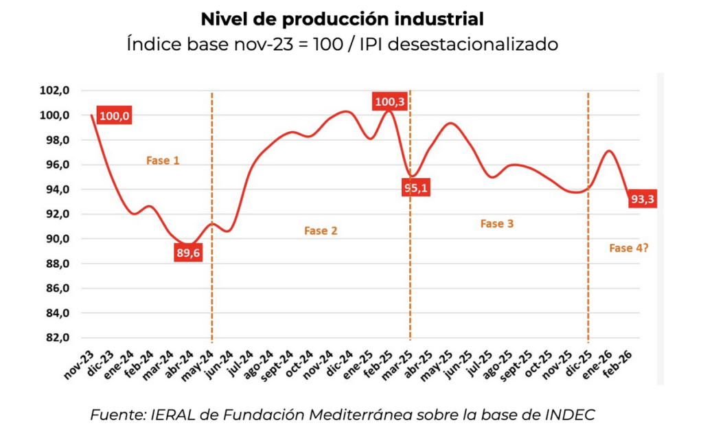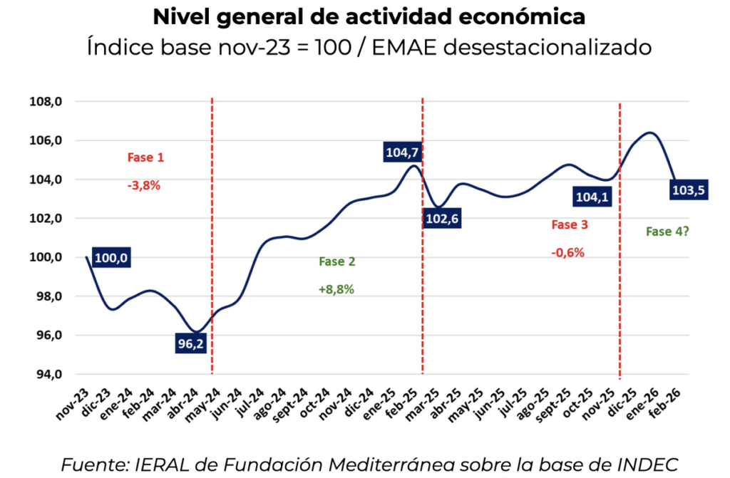 Aún con la volatilidad que presenta la actividad económica, se ubica 3,5% por encima del nivel de noviembre de 2023, mes previo al inicio de la presidencia de Milei. Por su parte, con la importante merma en febrero se registra una caída de 2,1% respecto al mismo mes de 2025. Hay que remontarse a 2024 para encontrar registros de caída interanual de esa magnitud.