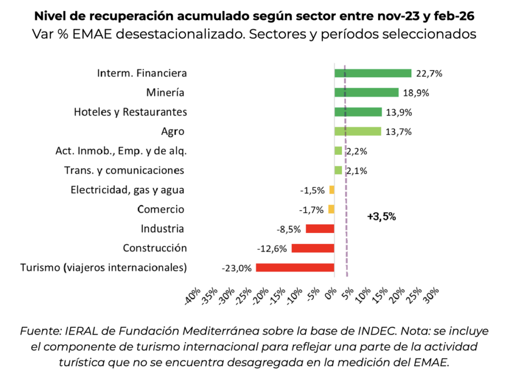 Con este desempeño, se tiene que desde noviembre de 2023 hasta la actualidad los sectores con mejor performance  incluyen a la intermediación financiera (+22,7%), la minería (18,9%) y el agro (13,7%). En la medición oficial se destaca también el sector Hoteles y Restaurantes, que refleja principalmente la realidad de los Restaurantes (debido a su composición) y que ha tenido cambios recientes en la información histórica.