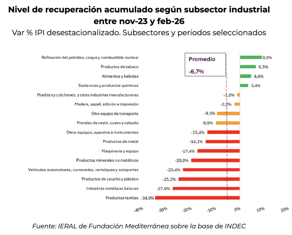 Si se observa en detalle los sectores que conforman la industria, apenas 4 de las 16 ramas principales están en terreno positivo en su nivel de recuperación desde noviembre 2023: refinación de petróleo y derivados (creció 9%), productos de tabaco (+6,5%), producción de alimentos y bebidas (+4,6%), Sustancias y productos químicos (+3,4%).