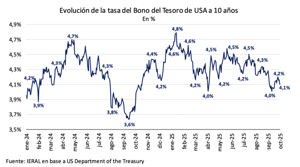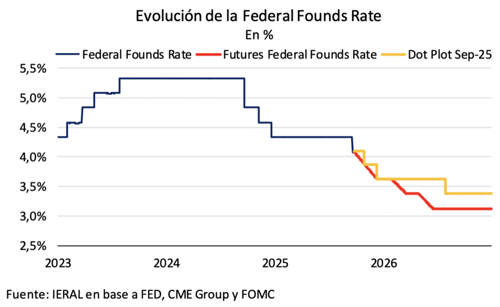 Después de la pausa desde diciembre del año pasado, en la reunión de septiembre la FED retomó el ciclo de bajas de la tasa de interés con un recorte de 25 bps, llevando el rango objetivo a 4,0%-4,25%, en línea con las expectativas de mercado.