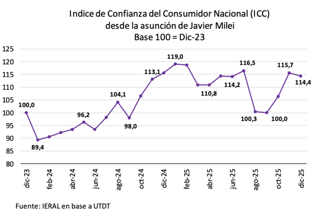 El 2025 cerró con niveles aceptables de confianza del consumidor y de crédito en la gestión del gobierno, de acuerdo a los índices elaborados por la Universidad Di Tella, y ese ambiente se cuantifica, por caso, en el constante aumento de los depósitos en moneda extranjera en el sistema bancario local. Pero el desafío es apuntalar esos indicadores, en un contexto en el que la tasa de inflación puede demorar en perforar el piso del 2,0 % mensual.