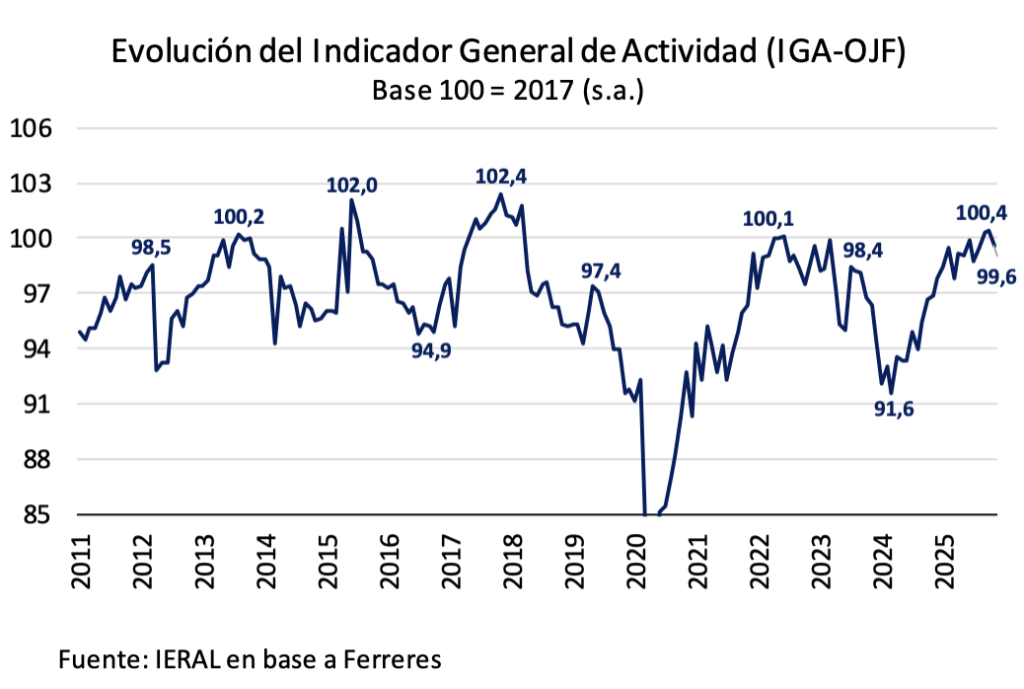 El “arrastre estadístico” de un año para el otro es muy limitado, por lo que no alcanza con mantenerse en el andarivel de los últimos meses. El nivel de actividad demanda recuperar dinamismo. Obsérvese al respecto el indicador que publica el Estudio Ferreres (IGA), que en once meses de 2025 se incrementó en promedio un 5,4 % contra igual período de 2024, pero viene desacelerando en la medición interanual, al punto que para noviembre 2025 marcó una variación de sólo 1,6 % contra igual mes de 2024.