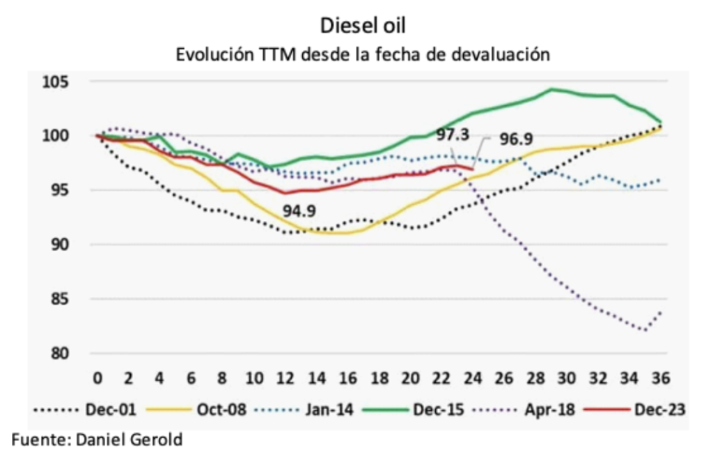 La desaceleración en el ritmo de crecimiento de la actividad hace que el consumo de gasoil todavía no haya recuperado el nivel previo a la devaluación de diciembre de 2023, curva que lo ubica en una posición intermedia comparando con anteriores planes de estabilización. A esto se agregan las turbulencias financieras previas a las legislativas, que dejaron su huella en términos de aumento de la morosidad en la cartera crediticia de los bancos, hasta un 4,2 %, y (el tiempo no pasa en vano) el fenómeno reciente de reversión de la mejora de los términos de intercambio: en noviembre pasado, los precios de los productos de exportación cayeron un 3,0 % interanual, y los de importación subieron 0,4 %, lo que implica una pérdida de poder adquisitivo de las exportaciones del orden de los 290 millones de dólares/mes, una cifra que anualizada equivale a 0,5 % del PIB. Este deterioro apunta a profundizarse en el arranque de 2026, y en algún caso podría afectar decisiones de inversión (ver artículo sobre el impacto del caso Venezuela).