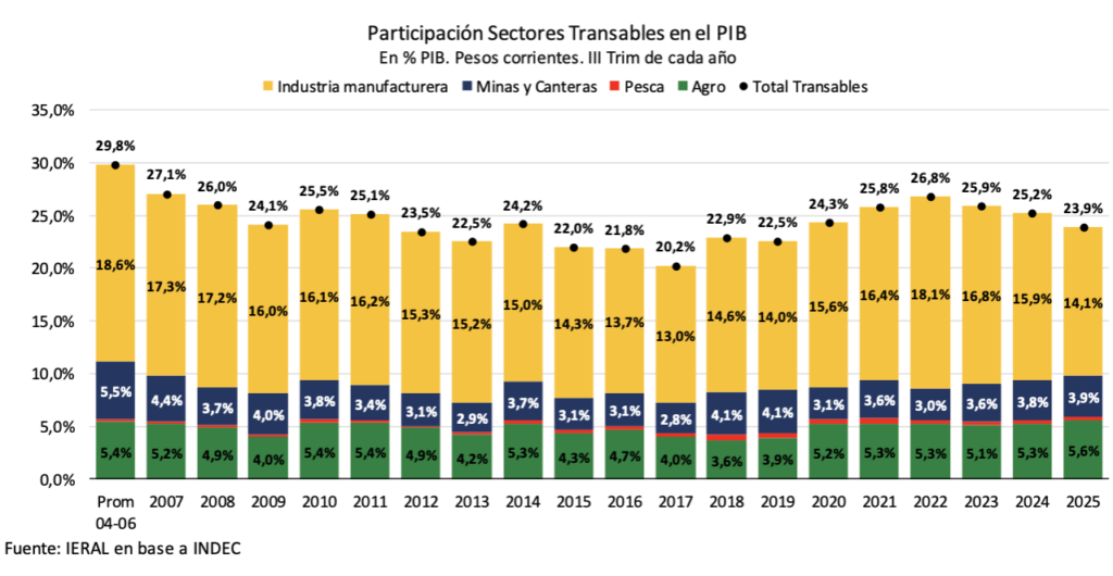 Dado el estancamiento de casi 15 años de la economía argentina, no es posible imaginar una recuperación sostenida y sustentable que pueda prescindir de las locomotoras de las exportaciones y de la inversión (con proyectos orientados a infraestructura y al mercado externo). Es inevitable que éstos sean los tractores del empleo y del consumo, pero el punto de partida muestra un poder multiplicador acotado, lejos del ideal. Obsérvese que, al tercer trimestre de 2025, los sectores transables capturan sólo el 23,9 % del PIB (medición a precios corrientes), unos 6,0 puntos porcentuales por debajo del período 2004/06. La ponderación en el PIB del sector de bienes transables es lo que define la “exportabilidad” de la estructura productiva del país, incluyéndose en esta categoría a la industria, la pesca, la agroindustria, minería e hidrocarburos.