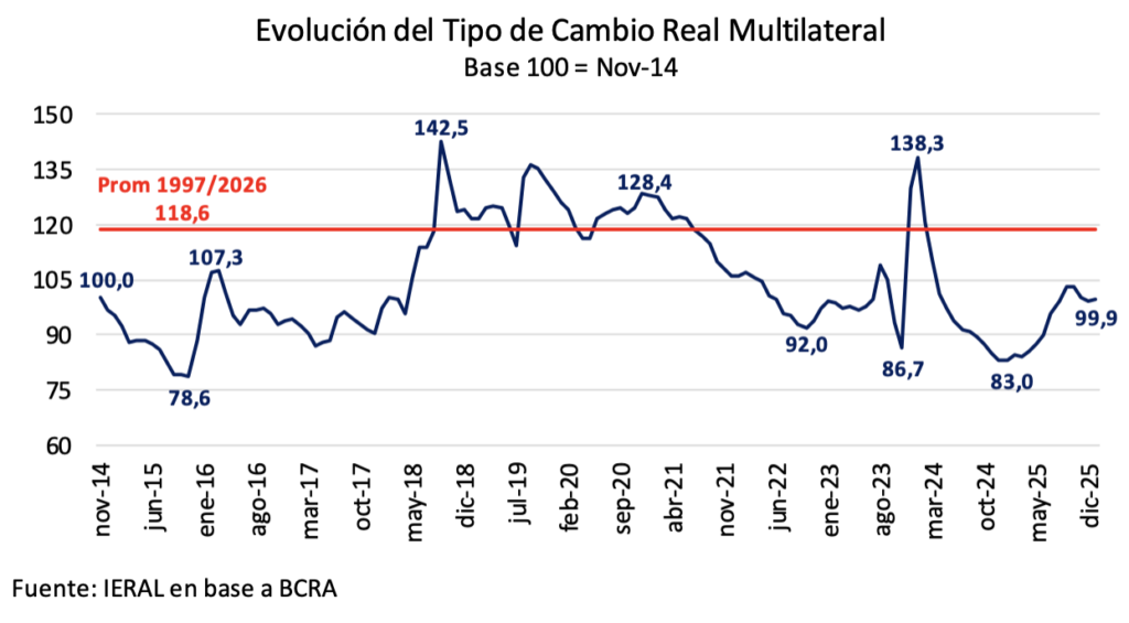 El nuevo esquema, con el techo de la banda deslizándose de acuerdo a la inflación pasada, tiende a cristalizar un tipo de cambio real (multilateral) en un nivel que se ubica un 20 % por encima del piso de principios de 2025, pero 16 % por debajo del promedio de 1997/2026.