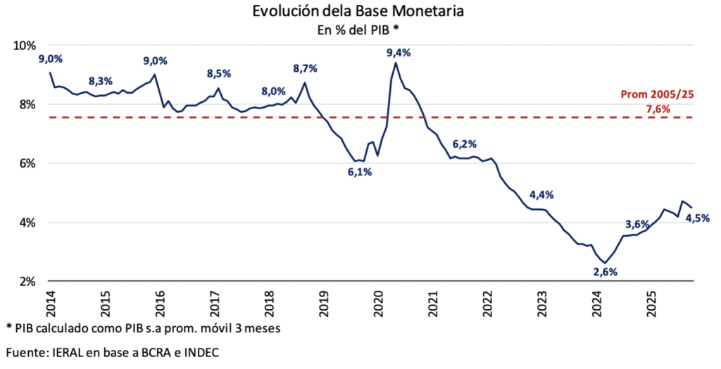 La demanda de dinero está determinada por varios factores, destacando la tasa de interés y el nivel de actividad económica. En la medida que la economía continue creciendo, la inflación siga desacelerando y se cuente con una tasa de interés real positiva, la demanda de pesos va a aumentar dado que la economía viene con un bajo nivel de monetización. Visto en números, la Base Monetaria (encajes + pesos circulantes) pasó de representar un 2,6% del PIB a fines del primer trimestre de 2024 a un 4,5% en la actualidad.