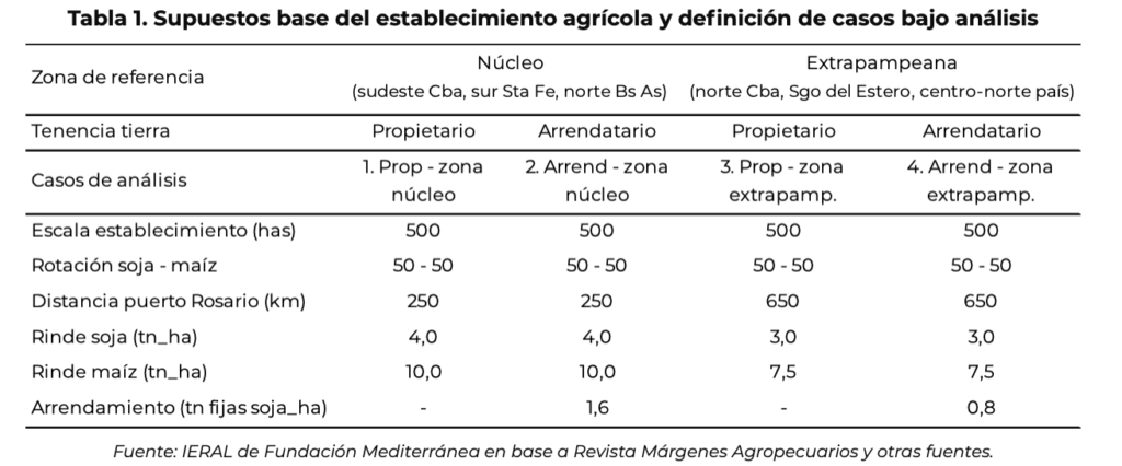 Para el seguimiento y estimación del resultado económico de producir granos se suponen establecimientos de una escala de 500 hectáreas, con un sistema básico de rotación de cultivos “50 y 50” entre soja y maíz. A partir de este supuesto base, se analizan cuatro casos que buscan captar al menos parte de la heterogeneidad del sector, definidos en función de la zona geográfica (zona núcleo – extrapampeana) y el régimen de tenencia de la tierra del establecimiento (campo propio – alquilado).