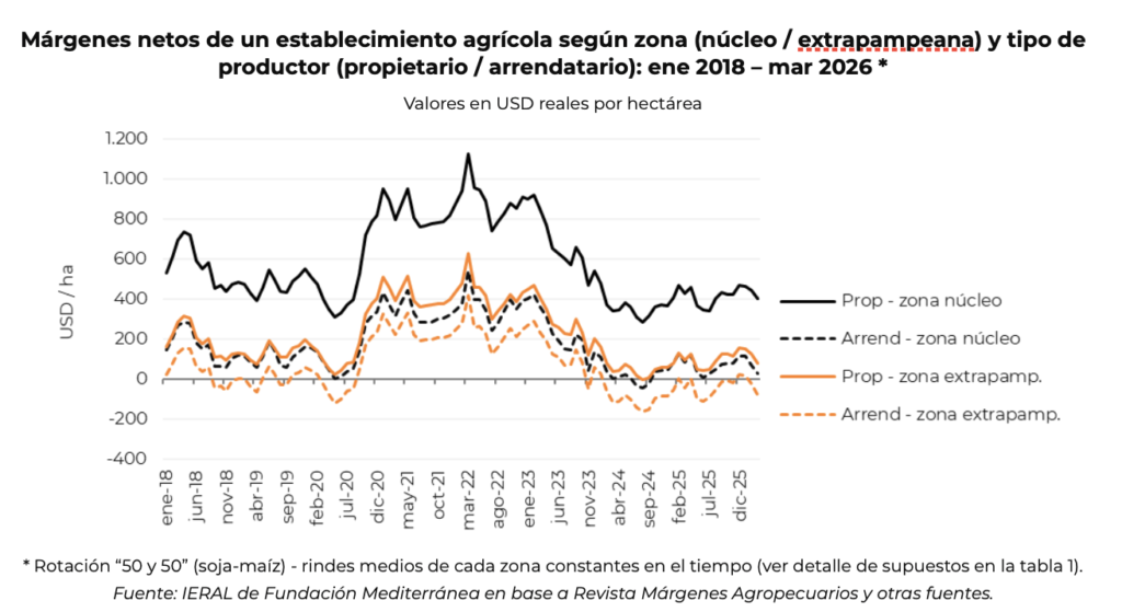 En marzo de 2026, los márgenes netos de productores propietarios se ubicaron en USD 402 por hectárea en zona núcleo y USD 81 por hectárea en zona extrapampeana. En el caso de los arrendatarios, los márgenes son más ajustados pero aún positivos en zona núcleo (USD 26 por hectárea) y se encuentran en terreno negativo en zona extrapampeana (-USD 78 por hectárea). Estos valores se ubican, en todos los casos, entre USD 140 – USD 190 por hectárea por debajo de su respectivo promedio mensual del período enero 2018-diciembre 2025.