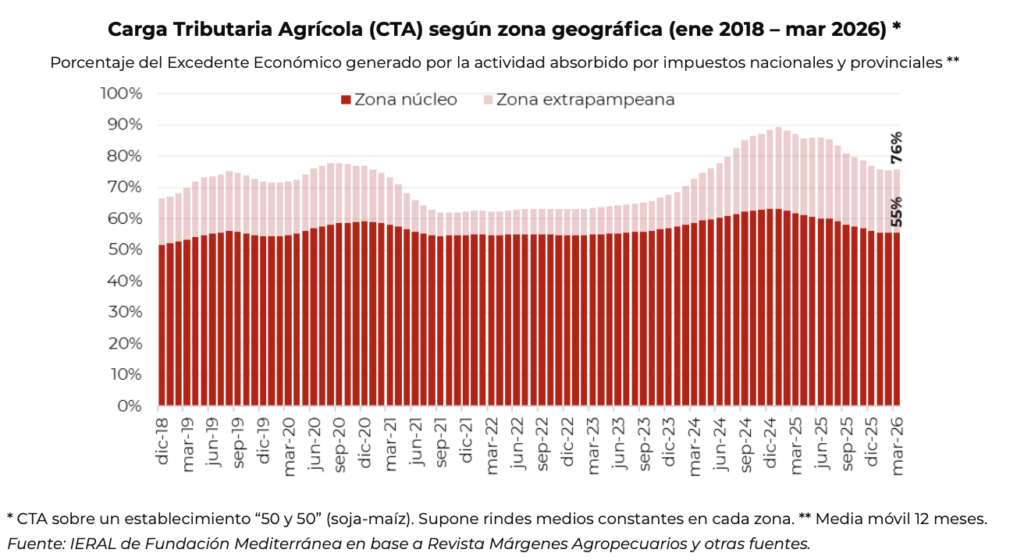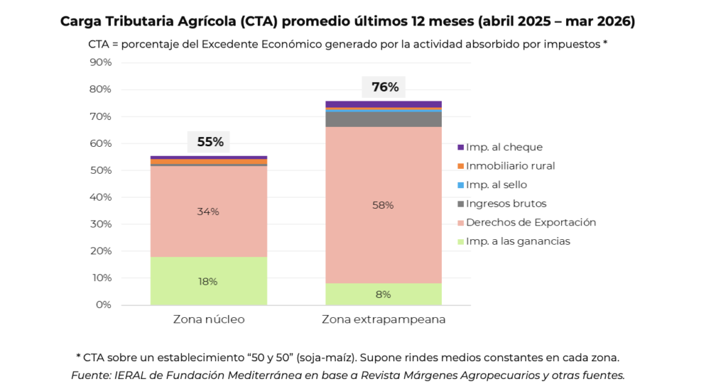Una aclaración importante es que la carga tributaria resulta mayor en la zona extrapampeana no porque allí se paguen más impuestos en términos absolutos, sino porque el excedente económico que puede generar la actividad —dados sus rindes, costos de producción y distancia a los puertos— es menor que en la zona núcleo, caracterizada por mayor productividad y mejores condiciones logísticas.
